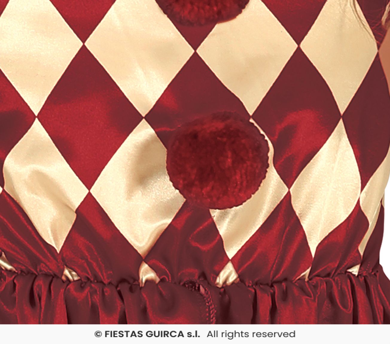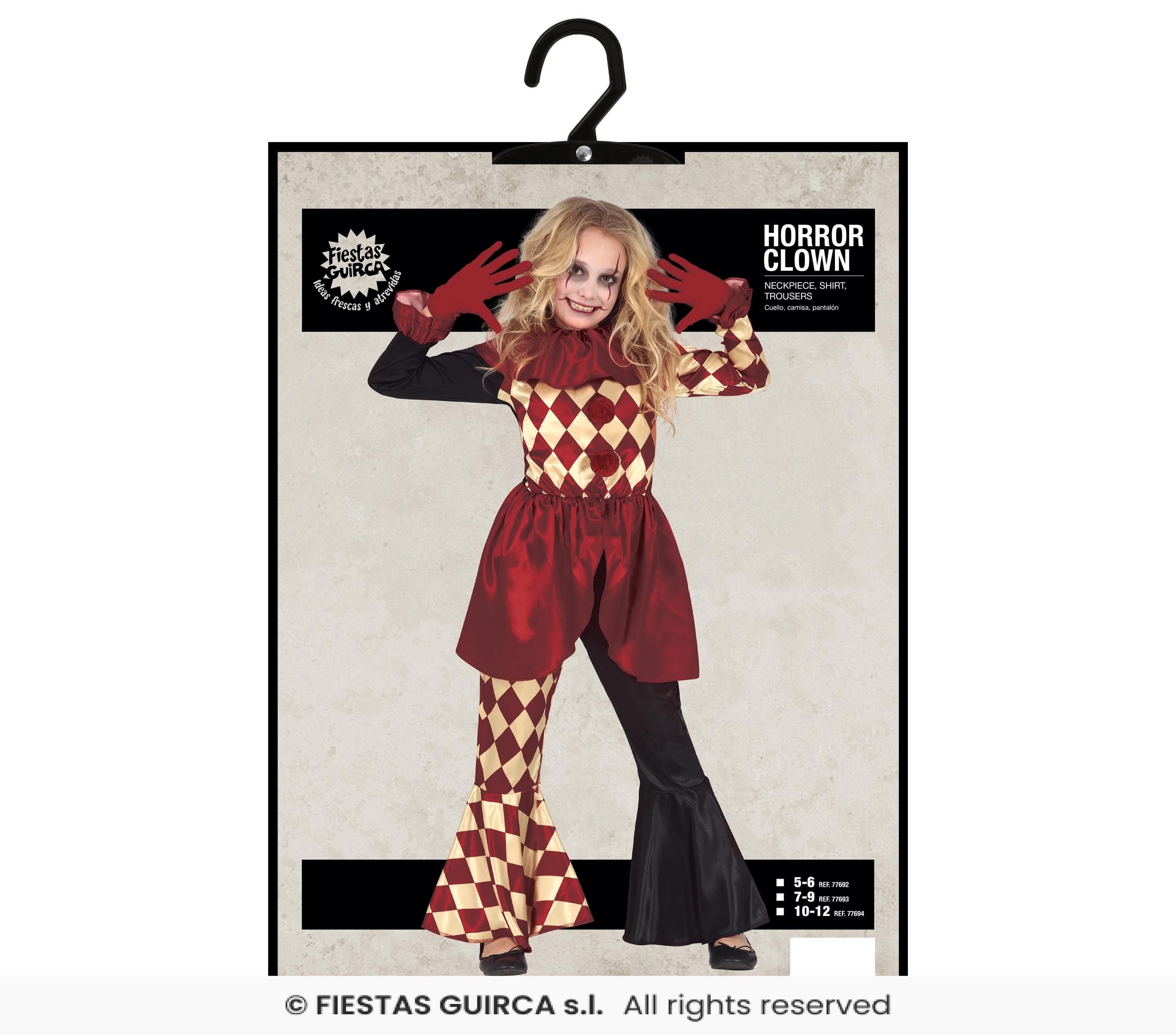 This Children's Vintage Style Chequered Clown Costume in burgundy and gold adds a unique twist with blood splatter detailing, perfect for themed parties or dramatic play. Complete with Trousers and Shirt with Pom poms & ruffled Neck.