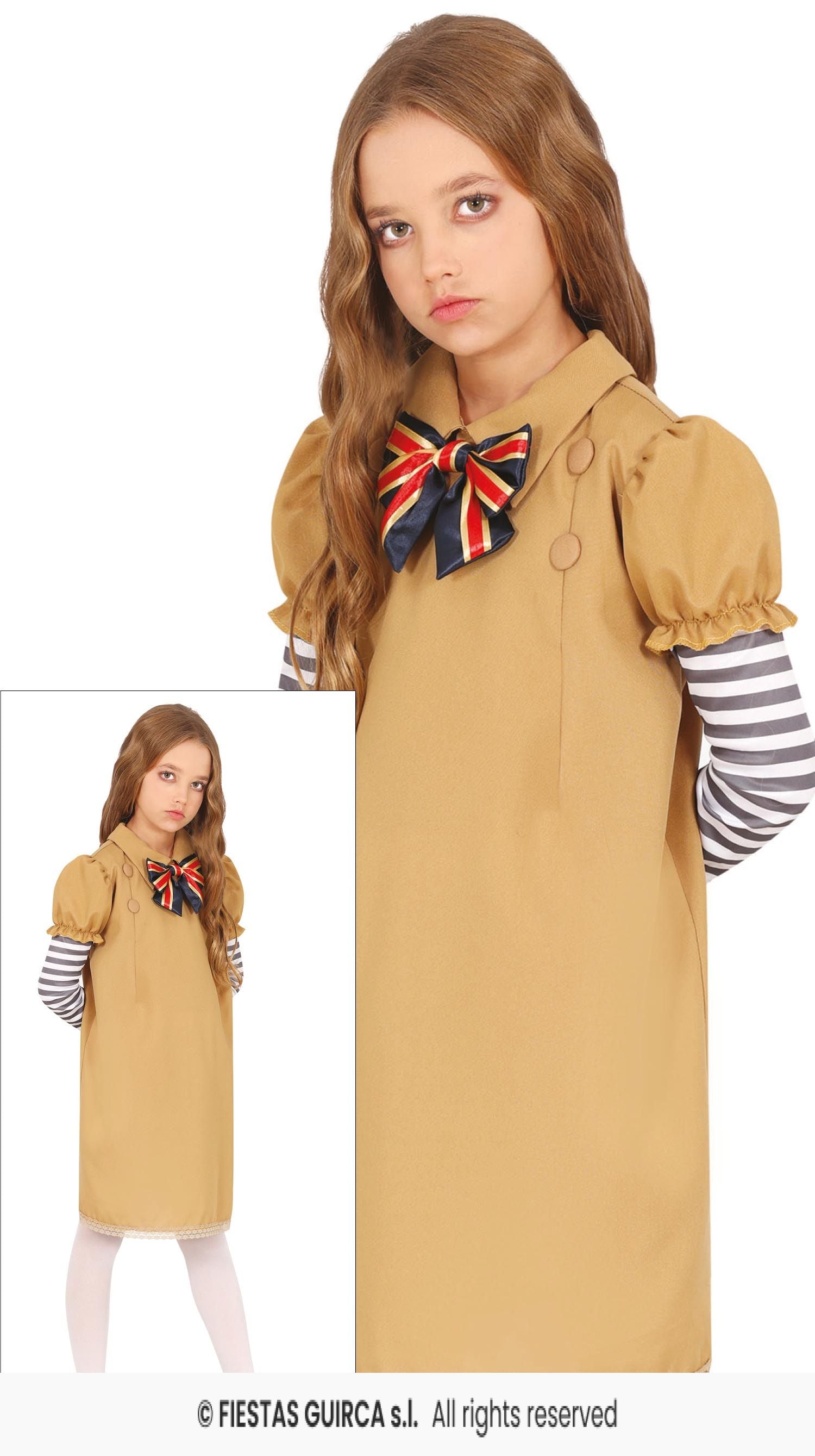 Nude / Beige coloured dress with attached Black & White striped sleeves. Also includes Vintage style Union Jack Bow Tie and lace trim.