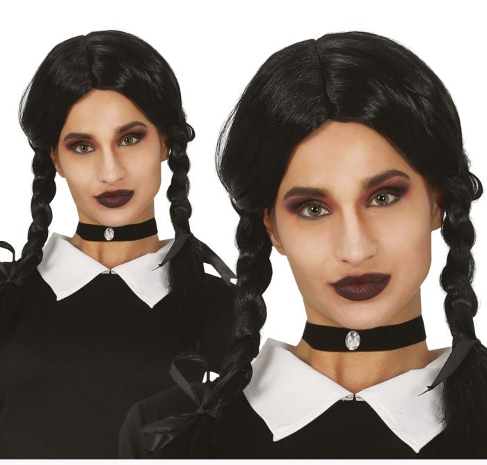 Transform into a gothic school girl with this Black Braided Wig & Bows. Easy to wear with elasticated fit. Halloween - TV & Film - Gothic