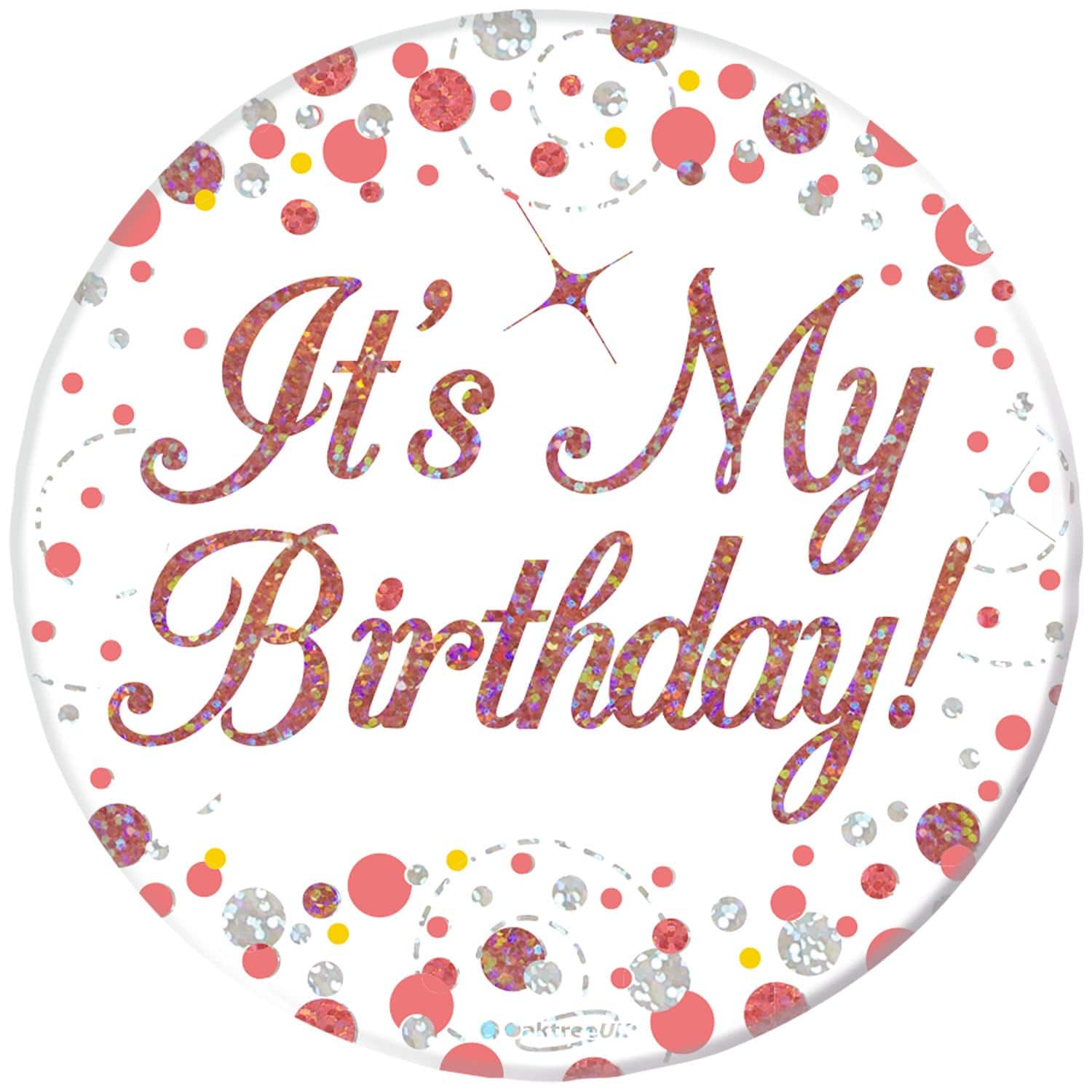 Sparkling 3 Inch Badge with "It's My Birthday" Holographic Rose Gold Design.
