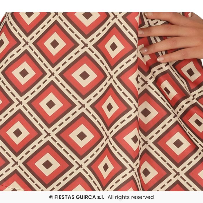 Get ready to hit the dancefloor in this impressive 70's style dress with flared sleeves. In a brown, burgundy and beige geometric pattern.